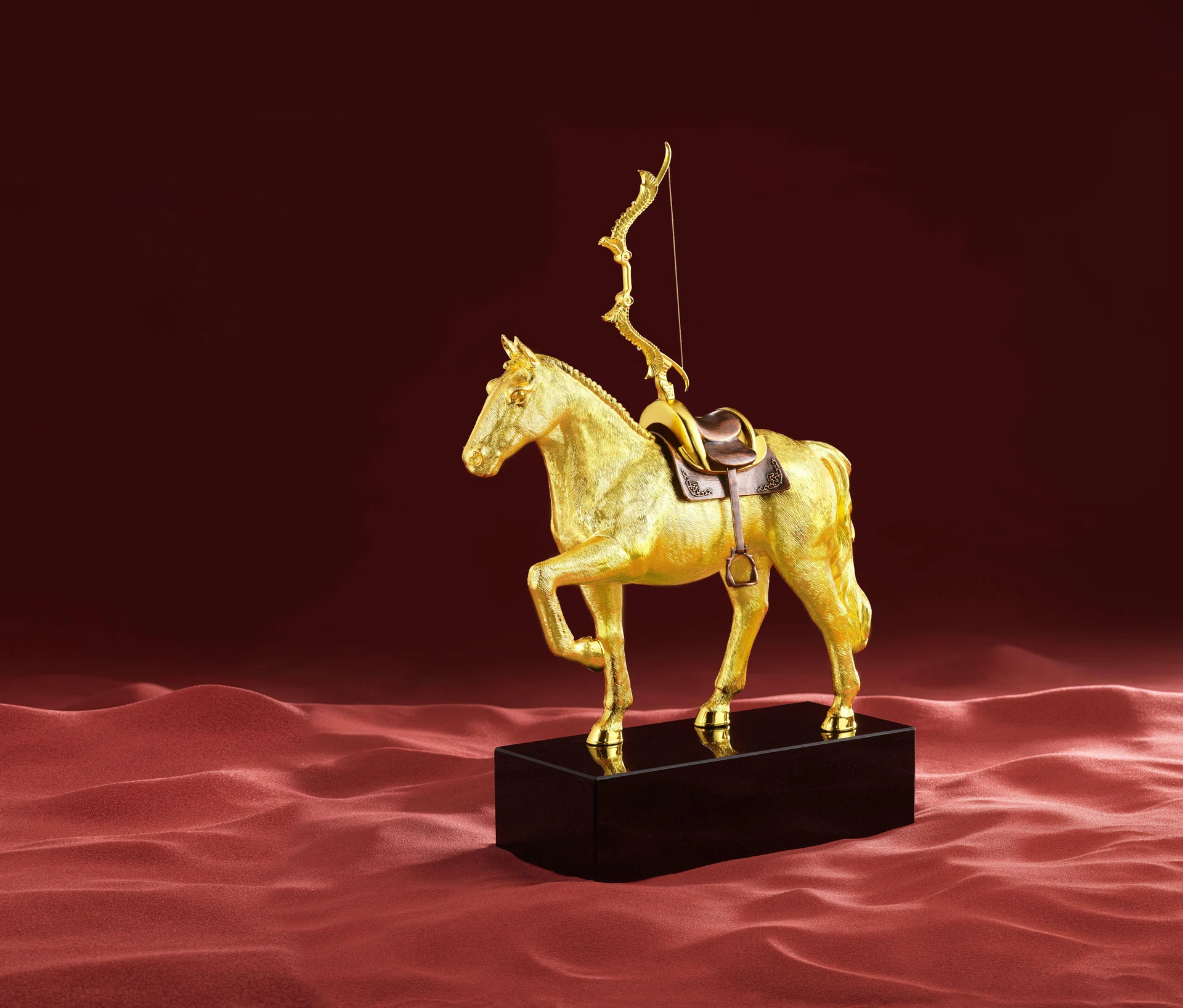 细节丰富的金色弓身引人注目,其上饰以龙鳞纹理与鹰翼意象,呼应《龙马精神》;同时,设计巧妙运用“弓”与“功”的双重含义,巧妙隐藏《马到功成》的双关寓意,象征成功与成就。作品镶嵌五种珍贵宝石,包括白色蓝宝石、黄色蓝宝石、红宝石、沙弗莱石与黑玛瑙,分别象征生生不息、源源不断的丰盛与富足。
