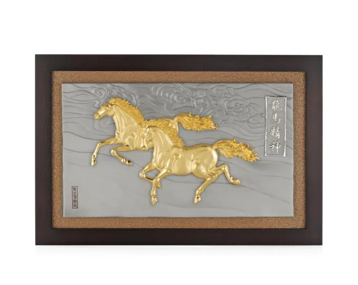 在历史中,马在战事和农务中扮演着重要角色,也是显赫地位和王侯贵族的象征。时至今日,马仍然象征自由、坚韧和奋进的意志,这些品质深受世世代代的敬仰。在皇家雪兰娥(Royal Selangor)的马与云浮牌匾中,一对雄健的骏马,在梦幻的天空和云彩背景下奔腾不息,象征光明和充满希望的未来。书法题字 “龙马精神”,则代表正值壮年之人的活力与朝气。
