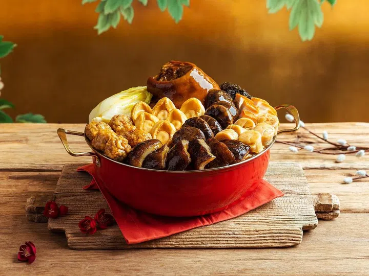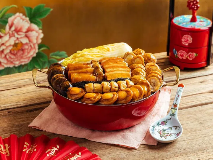 良木园酒店(Goodwood Park Hotel)旗下中餐馆岷江川菜馆(Min Jiang)和岷江在登布西山(Min Jiang at Dempsey Hill)各自提供不同年菜选择。前菜方面,可选择“岷江五福拼盘”或“岷江在登布西山五福拼盘”,前者包含冰镇迷你鲍鱼佐酸甜酱、油炸大虾佐明太子蛋黄酱、腌渍海蜇花、“伊比利亚”猪叉烧和妈蜜拳头鸡,后者则有莲藕炒虾、鸡肉卷、腌渍海蜇花、蒜茸炒软壳蟹、油炸山药配扇贝。另外,两间餐馆分别推出类似盆菜的“横财就手海味煲”、“幸福鲍鱼扣肉海味鸡煲 ”以及“凤凰金鲍海味花肉煲”,特别选用上等的新鲜食材,搭配用长时间熬制的浓郁高汤。所有的精华都紧缩在这一盆的食材之中,滋味极好。