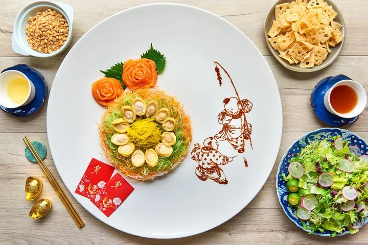 新加坡富丽敦酒店(The Fullerton Hotel)中餐厅玉楼的招牌三文鱼金箔香槟冻鱼生,每年会都根据不同生肖做出不一样的花样,今年配合鼠年,特别在鱼生内加入了蔓越莓口味芝士,因为有芝士就能引来老鼠。鱼生造型像是一只老鼠抱着金币,寓意着财运滚滚。