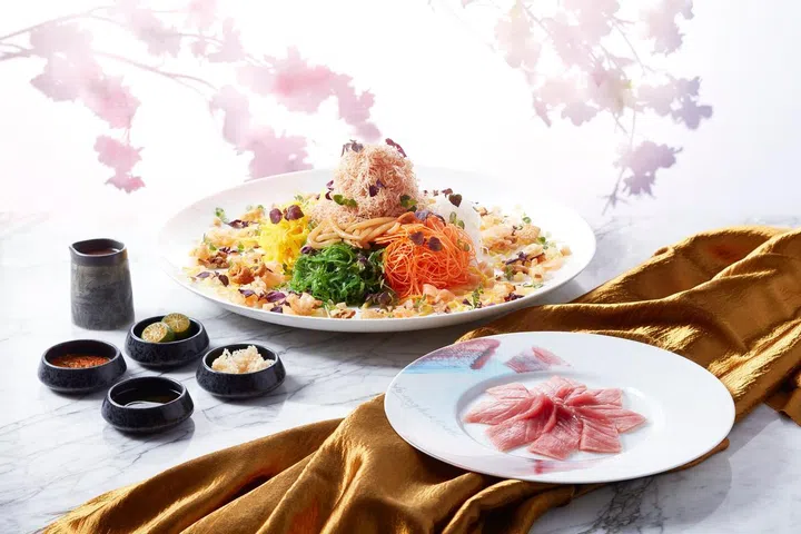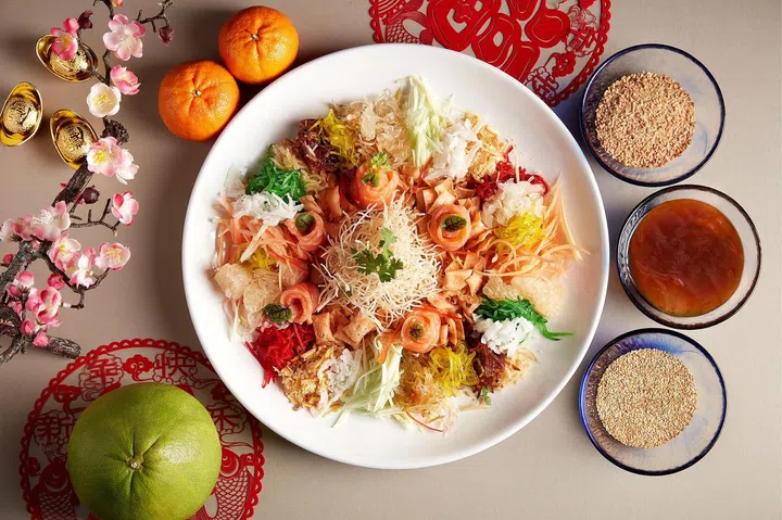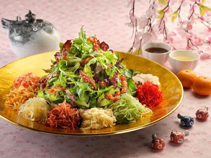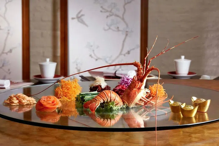 文华东方酒店(Mandarin Oriental Singapore)中餐馆樱桃园的招牌鱼生与超级巨无霸豪华盆菜,是农历新年“镇馆之宝”。这款招牌鱼生,混合了各种蔬菜丝、酥炸粉丝、炸鱼皮等材料,口感酥脆且爽口,再撒上三文鱼生和阿拉斯加蟹肉及黑松露片,营造多层次的味觉体验。此外,樱桃园的盆菜堪称新加坡最大,重约25公斤,采用四头鲍、龙虾、带子、大虾、16等食材,而且不同于一般浓稠的盆菜,汤汁清甜而味浓。