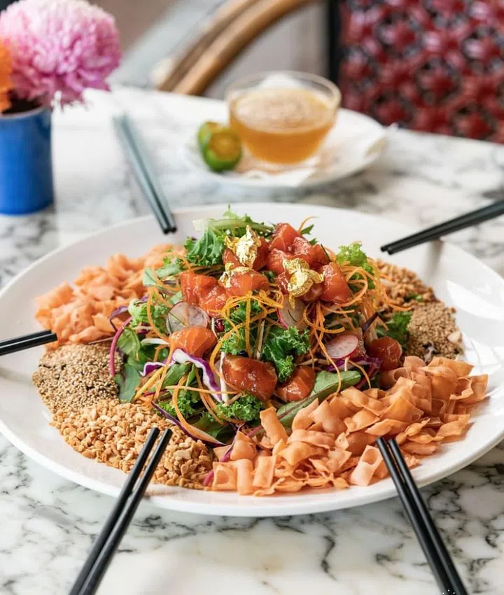 走非传统中餐路线的Chopsuey Cafe,总是在菜肴里注入在地特色和创意,就连年菜也不例外。餐厅推出的农历新年套餐,分四至六人和七至十人两种,主角当然是独树一帜的幸运发财鱼生。厨师以鳟鱼肉取代传统的三文鱼,混合羽衣甘藍、芹菜、豆芽、红萝卜丝、蓝莓和菰米(wild rice),再淋上以酸酐、柠檬汁、梅酱、橘子酱和日本醋调配成的酱料,口感清爽。套餐里值得推荐的菜肴包括烧锅炒饭、罗望子炒虎虾、香煎鳕鱼混蒜蓉辣椒酱、仁当炸鸡等,充满南洋风味,很接地气的年菜套餐。