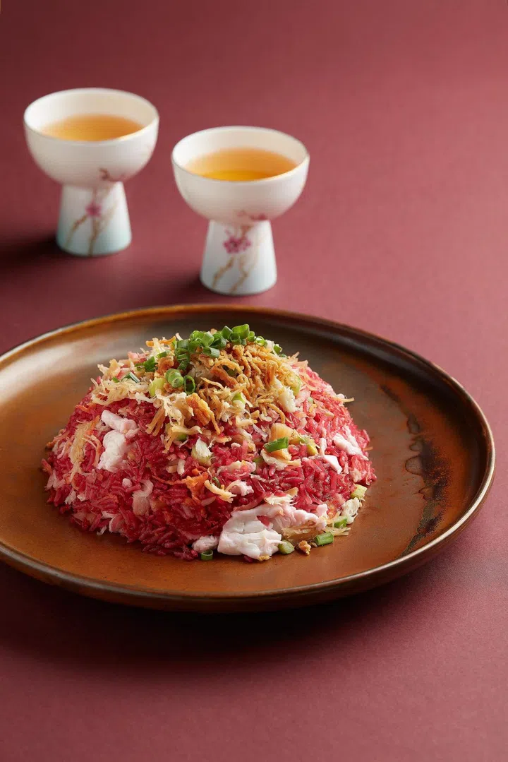 主菜方面,“瑶柱蛋白蟹肉芦笋红菜汁炒饭”以香港风味为基础,将新鲜芦笋、蟹肉与传统瑶柱蛋白炒饭结合。特别之处在于烹炒过程中加入甜菜根汁,使每一粒米饭都染上鲜艳红色。