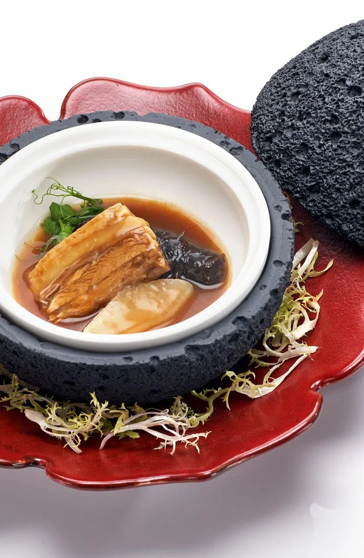 前菜选择包括融入川菜经典风味的“核桃川味口水海参”,鲜美嫩滑海参遇上经典川味口水鸡的麻辣鲜香,再搭配核桃增添香脆口感,令整道菜富有层次感。还有一道“百味竹炭豆腐”,外层炸得酥脆,现出竹炭独特的深邃质感,与内里洁白如雪的嫩滑豆腐,形成鲜明对比。