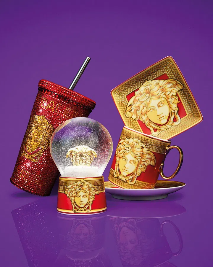 范思哲(Versace) 2022假日系列运用高光手法,以奢华意趣凸显本季服装及配饰系列的特点。假日系列除了包括经典的Greca Goddess迷宫女神包和Odissea飞船鞋外,也有华丽金色配饰缀以标志性美杜莎元素的奢华时装,家居精品则包括了水晶饰面的Medusa铆钉旅行杯、雪花玻璃球以及不同尺寸的精美餐盘,令假日季更加闪亮耀眼。该系列中的家居装饰均注入品牌标志性元素——Greca和Barocco图案,并采用上乘材料,为家中平添奢华韵味,体现Versace品牌的非凡魅力。