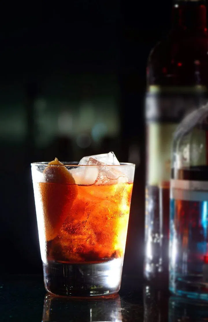 做法:在经典鸡尾酒杯内放入四方冰块,将材料包括朗姆酒、糖浆、利口酒和酊剂混合均匀,再加上橙子皮装饰即可。