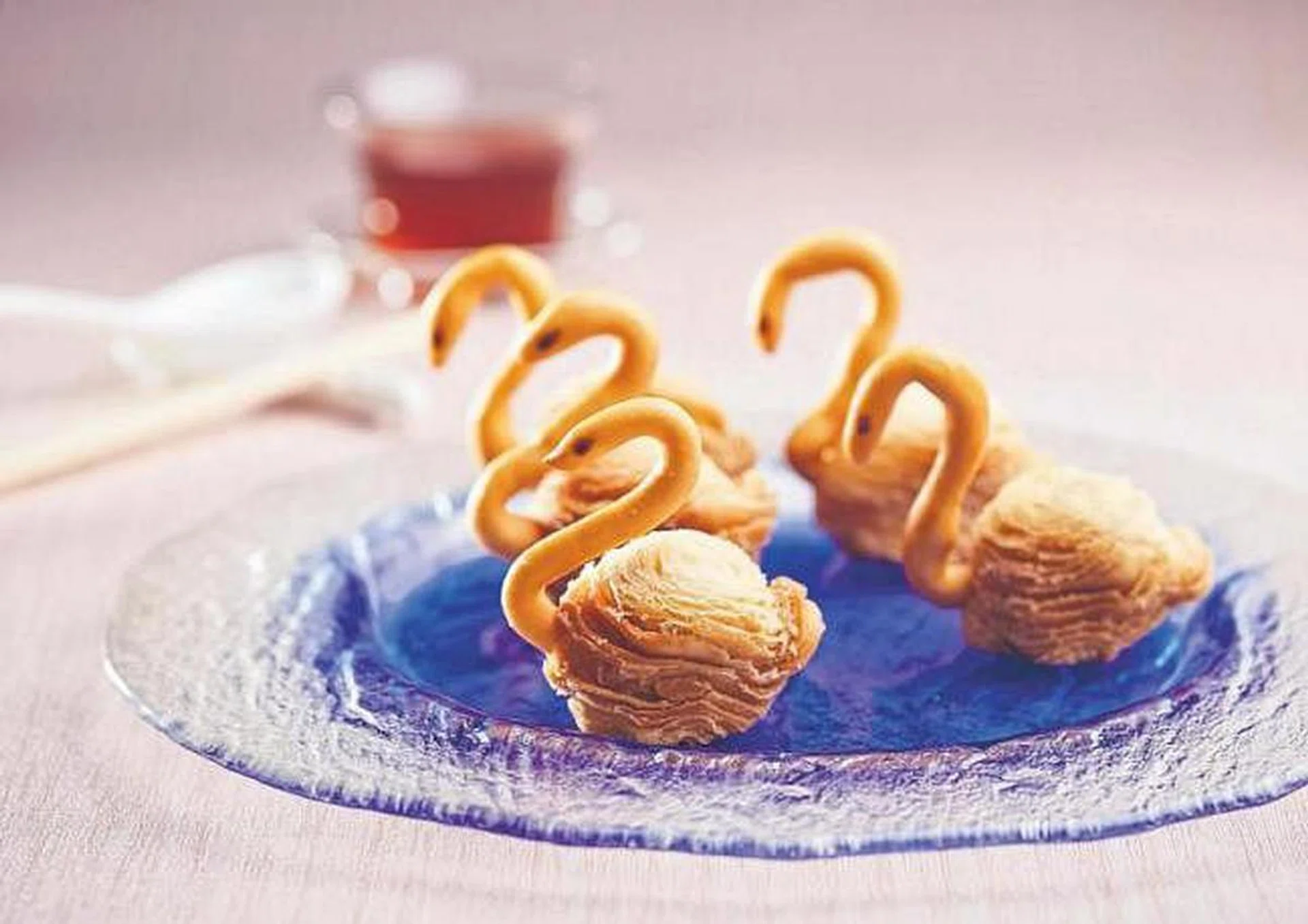 光是头盘,已聚集三种不同风味,有熏鸭片配芒果及酸辣酱、焗鹅肝、松露及鸡肉碎薄脆派、蒸白豆腐配雪蟹腿。古师傅说:“金牡丹有一道招牌的金薯酥是甜品,我一直想找出咸味的做法,后用鹅肝、鸡肉泥,再用意大利黑松露去逗弄,最后将之编成天鹅的造型。