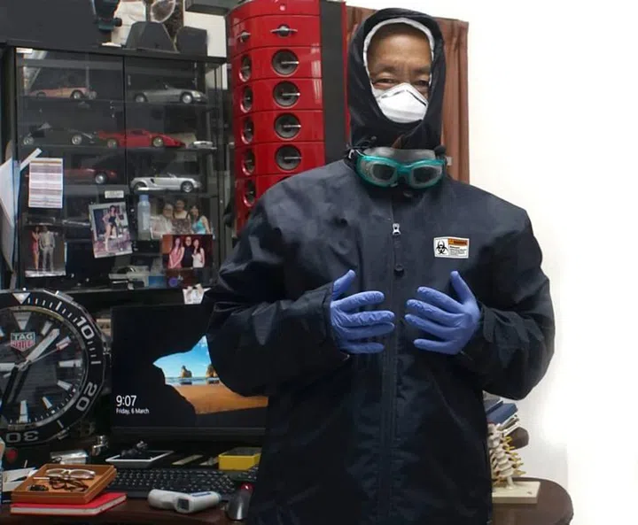 钟卫国医生(Dr Bernard Cheong)的工作装备。他在诊所里会穿戴防护衣、手套、口罩、防护镜,每天也会消毒房间。