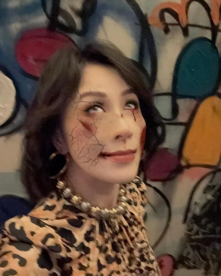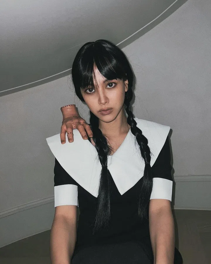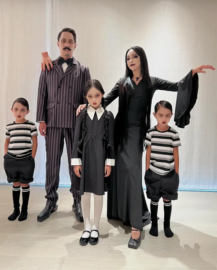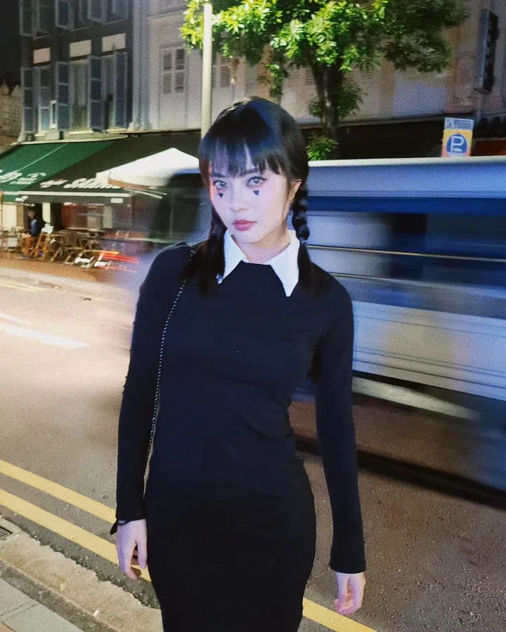 与黄思恬出席同一场万圣节派对的黄暄婷,以经典亚当斯一家(The Addams Family)剧中人物Wednesday造型亮相,并在妆容上加入可爱的黑色心形标志,为暗黑穿搭注入俏皮元素。