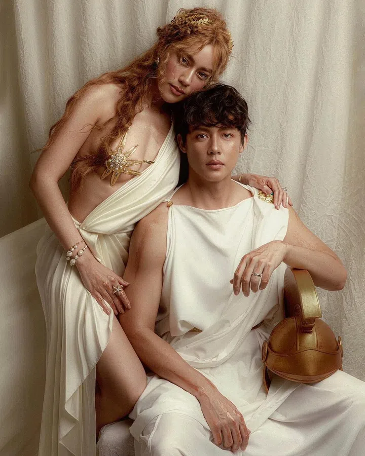 "爱是世界上最强大的力量。"新婚夫妻Mark Prin和Kimberley Anne Woltemas以古希腊神话中的战争之神Ares与爱情与美丽的女神Aphrodite造型,以爱之名迎接万圣节。女方的白色造型来自泰国服饰品牌Vatanika。