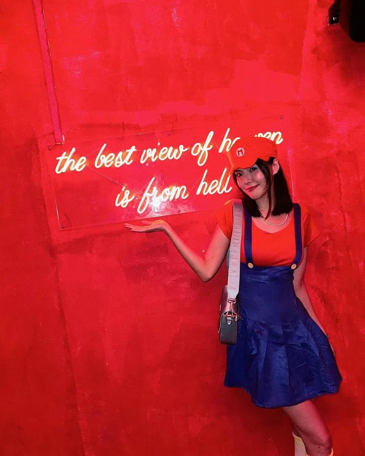 本地演员黄思恬以一身马里奥兄弟的造型参加万圣节派对,变身窈窕俏丽的游戏人物。