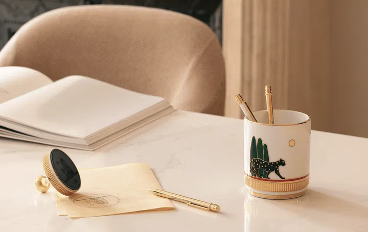 除了高级珠宝和腕表,Cartier选择丰富的生活家居精品也俘虏了许多人的心,从家品摆件到文具,均贯彻了品牌华丽优雅的气息。家居系列中,包含了书写工具和书桌饰品,其中一款PANTHÈRE DE CARTIER猎豹笔筒,印有品牌标志性的美洲豹图案,色彩鲜明的色调,为书桌带来时髦亮丽的气息。
