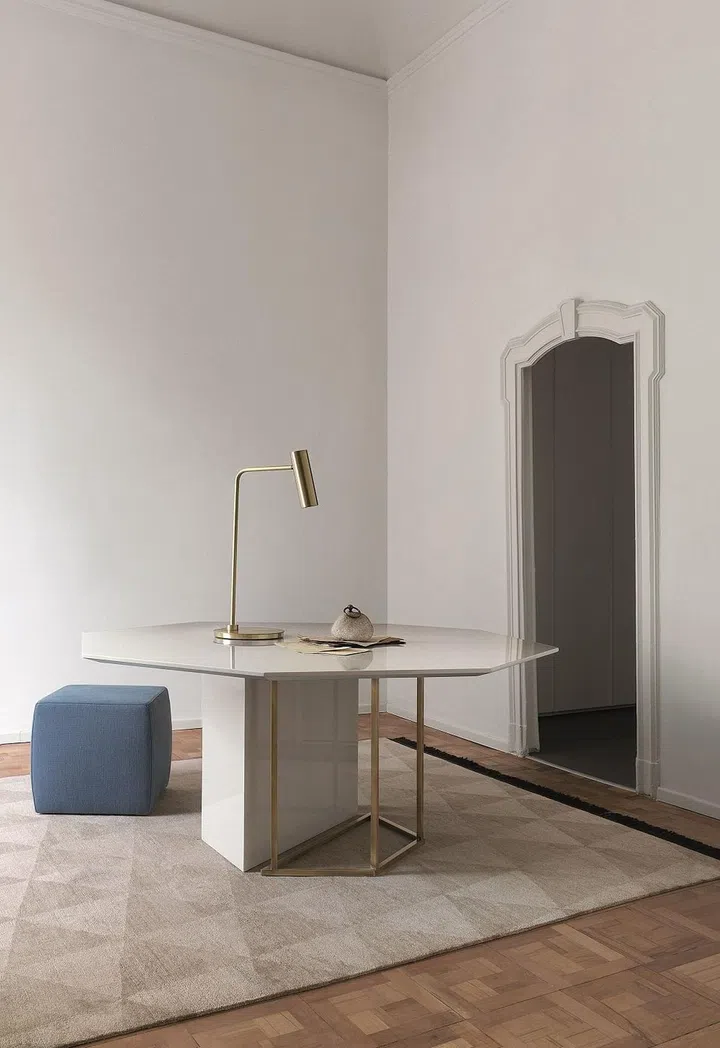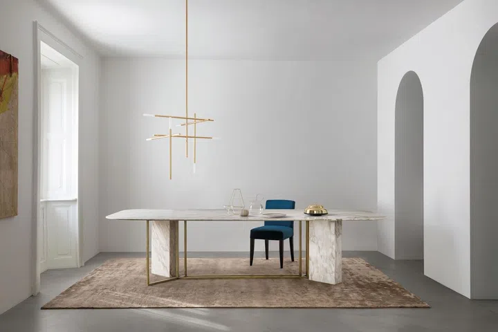 黑色或铜色的金属式底座,搭配大理石桌面或不同的木材色调和漆面饰面,不同材质都可交替使用、相辅相成,打造虚实结合的设计效果。
