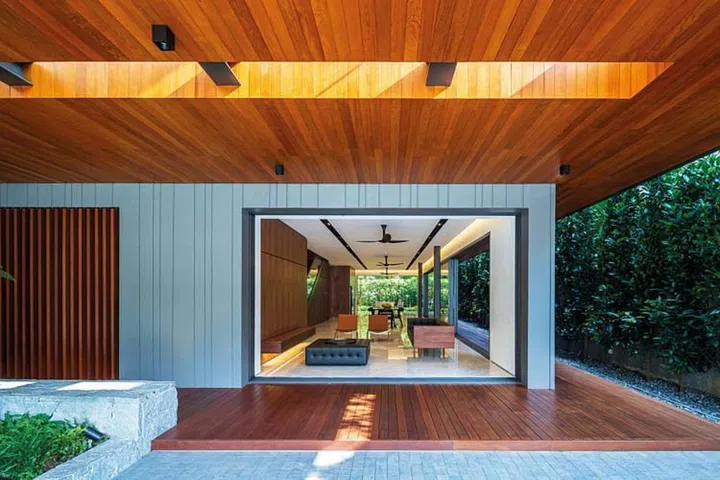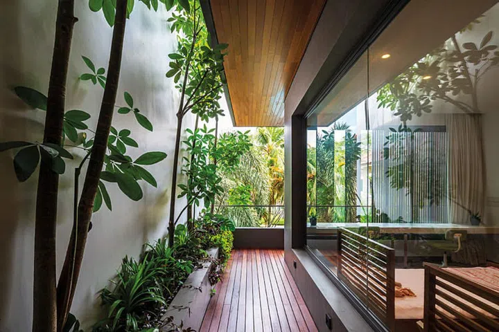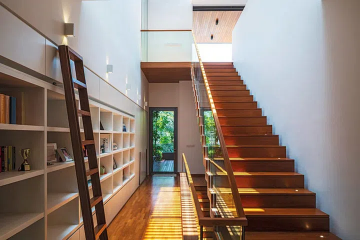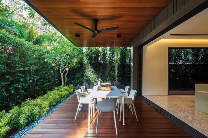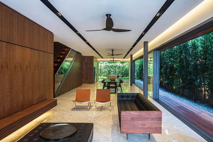 考虑到本地热带岛国气候,房子设计上极为注重防晒和通风,每层楼的设计都务求让风的流动通畅无阻,在有需要的情况下,开放式的房子也能完全“封闭”起来,隔绝暴雨或污染烟霾的来袭。