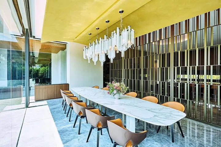 每个空间都经过蔡智勇精密计算,一楼地面层分为客厅、饭厅和厨房。他说:“位于中央的巨型螺旋梯既是视觉焦点也是空间艺术。” 大门入口的会客厅专门招待客人,沙发更细分为男宾和女眷两区,让客人可以好好地放松聊天,位于后方饭厅旁的客厅才是家人共聚的小天地,巧妙地连接泳池,只要推开巨型玻璃门,就能连接开放式庭院引景入室,也让家人的户外活动与室内无缝接轨。