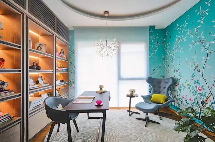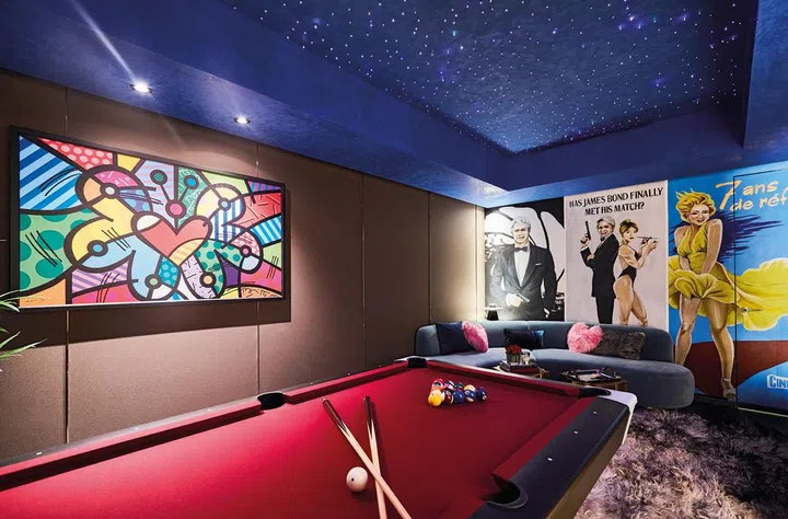 一楼是生活起居重心,地下层则是主人与同好品酒作乐的娱乐室,放置了桌球与KTV音响,这里隔音设备极好,即便高歌至深夜都不会担心扰民;一改楼上的沉稳格调,采用电影海报与巴西画家Romero Britto色彩鲜艳的涂鸦作品Evolution作为装饰,为室内增添活泼感。