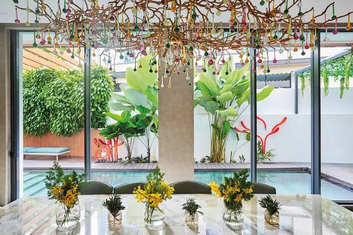 餐桌上方灯七彩斑斓的葡萄牙知名Bijout by Serip吊灯与会客厅墙上法国艺术家Jean Francois Larrieu充满生命力的作品 “Tree of Life”巧妙地呼应。
