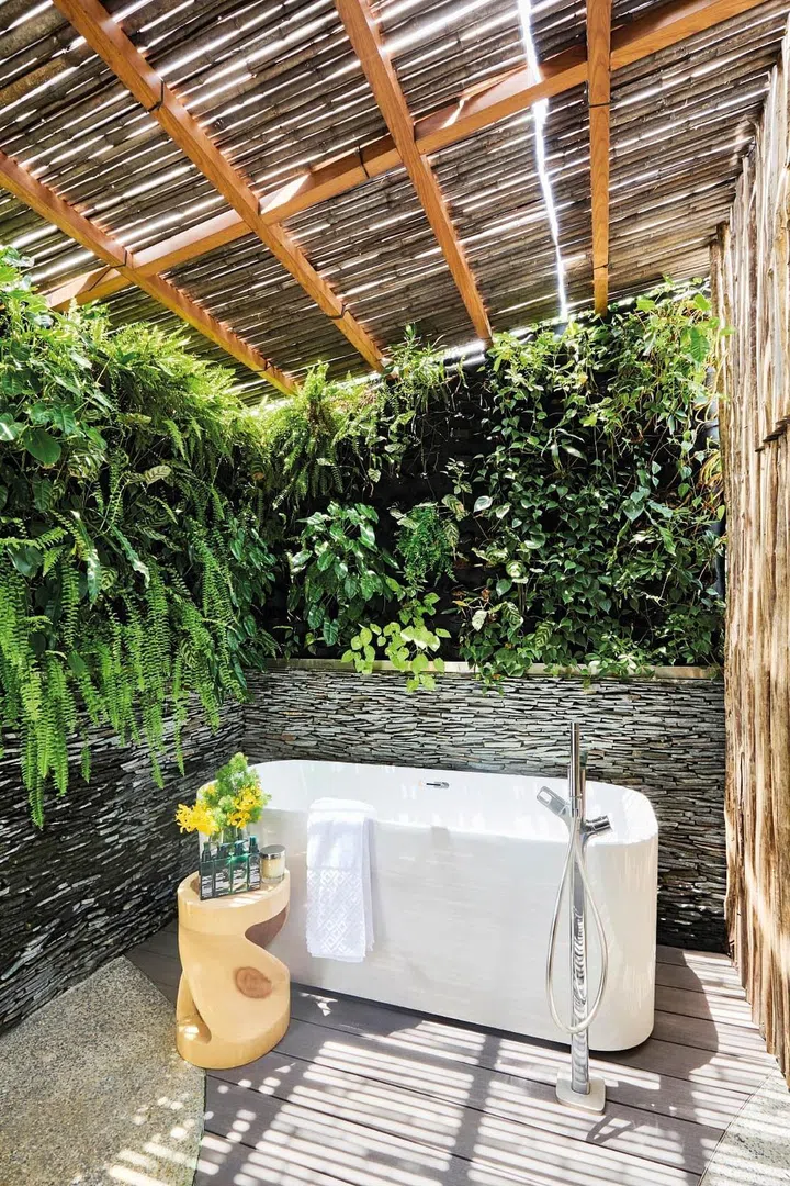 二楼分为开放式办公区、客房及专业健身房,除了基本的重训器材,还有一张皮拉提核心床(Pilates Reformer)。“我有皮拉提教练证。”58岁的她身材健美,冻龄秘诀是一周六次运动及控制饮食。 三楼主要是夫妻的私领域,分为三个区域:主卧、衣帽间;浴室另一侧接连的是户外泡澡区,以植物墙高高围绕不会春光乍泄,同时又能仰望蓝天或星,c’est la vie!
