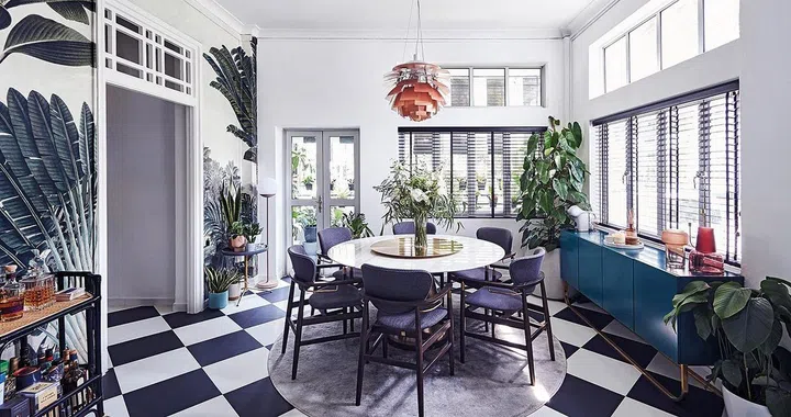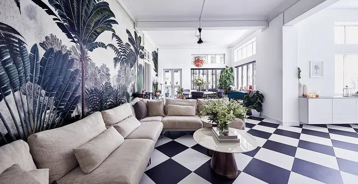 从玄关处开始延铺到会客厅的黑白菱形地板,绿意盎然的雨林壁纸,藤制移动酒架,再加上阳台挂满的绿叶植物,勾勒出惬意舒适的度假氛围。“这个家是我的避世天堂,一踏入玄关就好像到了度假别墅,让我每天回到家的心情都很好。”