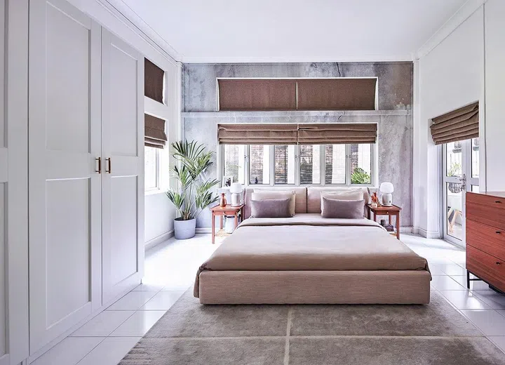 有别于公共区域的华丽风格,主卧室是充满大地色调的撒哈拉沙漠风格,木床依着两扇巨型窗户,回廊种植了大盆栽,引进绿意又有阻挡路人窥探的作用,让主人保有隐私;侧边窗户面对一块小草地,年底季候风吹起时,带进一室舒爽凉风,犹如在小岛上度假。