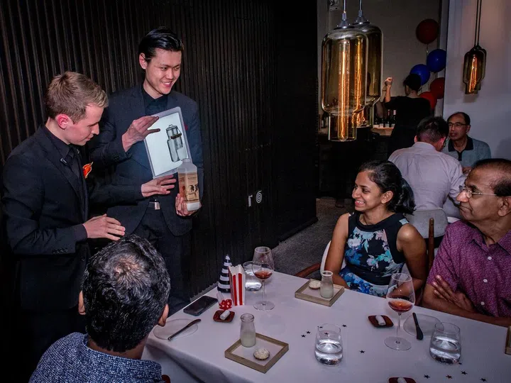 江振诚与Albert Adria在2010年的“世界50最佳餐厅”在伦敦的颁奖典礼上相遇,那时江振诚代表Jaan,第一次入围榜单。继六月与澳洲名餐厅Brae主厨Dan Hunter合作后,这次与Albert Adria的合作是江振诚主厨今年第二次主持“四手联弹”,他为这次的合作下足了心思,“表演”当天,Restaurant Andre也增添上了许多马戏团的装饰,爆米花、气球、游戏……甚至请来了专业魔术师为宾客用餐助兴。