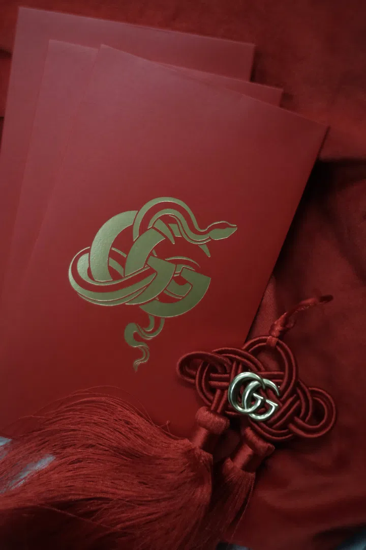 Tory Burch 采用深红绒布取代传统红包纸质,搭配烫金蛇鳞,缠绕在表面,显得特别典雅高贵。
