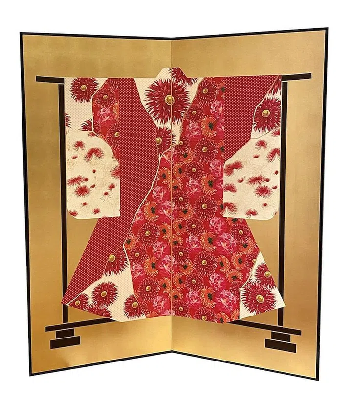 这款以舞伎(Maiko)红白脸妆及和服为设计灵感的屏风,体现高田贤三对日本传统艺术的尊崇和热爱。