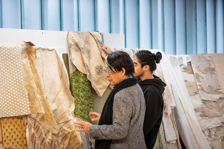 高田贤三(左)与创意助理Engelbert Honorat严选各种精致家具面料,态度一丝不苟。
