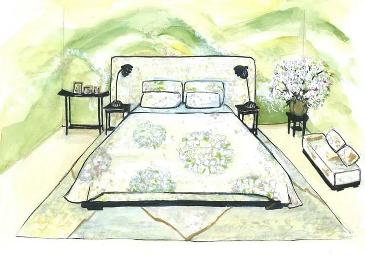高田贤三的崭新家具和家饰品草图,以樱花为主题,充满春天的清新气息。