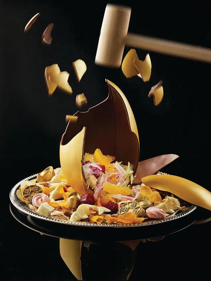 Antoinette广受好评的“金蛋”鱼生The Queen’s Yu Sheng又回来了!一个巨型巧克力金蛋,用木锤砸开来,巧克力制作的金鱼、金元宝、金币、五香杏仁、腰果、橘子黄油蛋糕、蛋白甜饼,山药和红薯片等“宝物”便揭开了真容。除了这个“金蛋”鱼生,Orh Nee Cake、Orh Nee Macaron、Antoinette “Singapura” Cookie Tin都是特别为新年准备,适合带回家,亲朋好友到家中做客时的小食,也可以作为伴手礼相赠。