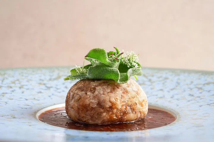 Jay Teo以创意十足的方式,将自己钟爱的中式美食,包括脆皮五花肉和叉烧,注入异国元素,塑造让人惊喜的新派菜品。人人爱的脆皮五花肉,以韩国传统料理菜包肉(Korean Bossam)的概念焕新诠释,用生菜和腌渍小菜包裹着脆皮五花肉,加上大量的香菜青酱和酸酸甜甜的鱼露焦糖酱汁,衬托出肉质的鲜甜,一口咬下,丰富的滋味变化在舌尖蔓延。主厨早期也曾在西班牙的米其林星级餐馆La Botica Matapozuelos任职,受到西班牙美食文化的熏陶,以中式的腊肠融入西班牙经典小吃可乐饼(Croquette)。