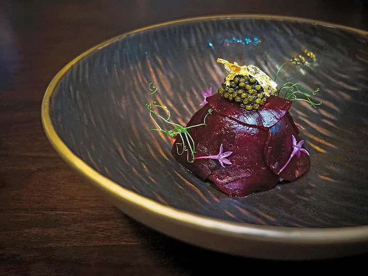 越简单的菜式,往往越考验厨师的功力。他设计的晚餐菜单中,首道菜品“开水白菜”是四川经典名菜之一,以金华火腿和鸭等食材熬制汤汁,加入意大利帕尔玛火腿添加咸香味,再以西式的冷过滤手法,淬炼出清澈而浓郁的汤汁精华,看似素简,平平无奇,却蕴藏丰富醇厚的美味,反映出主厨的艺高胆大。