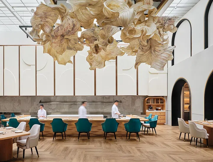作为一家高档餐馆,BORN在空间设计上也落足心思。主要的座位餐区以外,设有两个私人厢房,分别可容纳四人和八人。装潢现代简约却不乏戏剧性元素,悬挂在主厅的巨型纸雕,气势十足,紧扣视线焦点,由荷兰纸雕艺术家Peter Gentenaar制作,如巨浪般的流线形设计呼应餐馆核心理念“生命的轮回”。不仅是美食宛如精致的艺术品,踏入餐馆室内,也让人仿佛置身于漂亮的艺术馆,享受着视觉和味觉的双重盛宴。