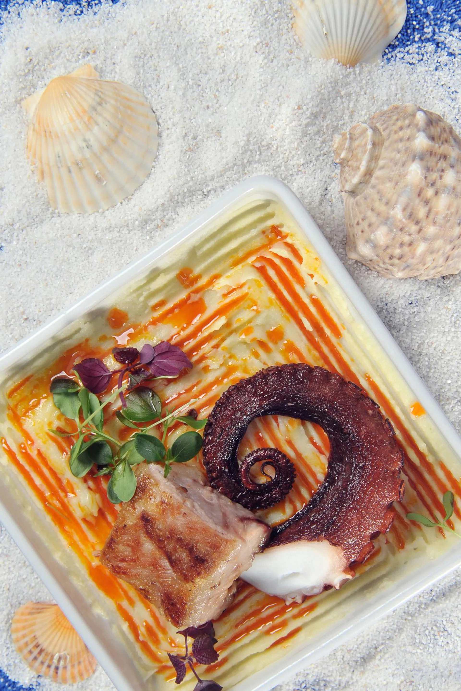 whipped goat cheese, candied grapefruit)或八爪鱼与猪颈肉(grilled octopus, crusty pork jowl, buttered mashed potato, smoked spanish paprika oil )。