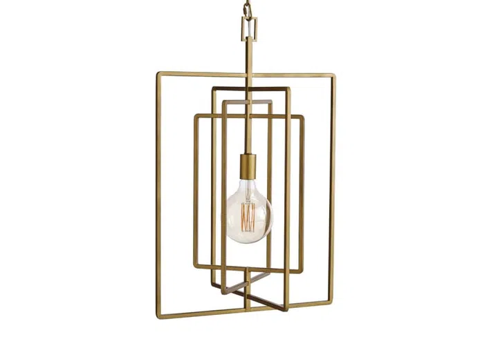悬挂在天花板上的水晶吊灯很吸睛,Crate and Barrell的这款与传统的水晶灯很不一样,以铜制长方型框架,为整个空间增添摩登几何感。