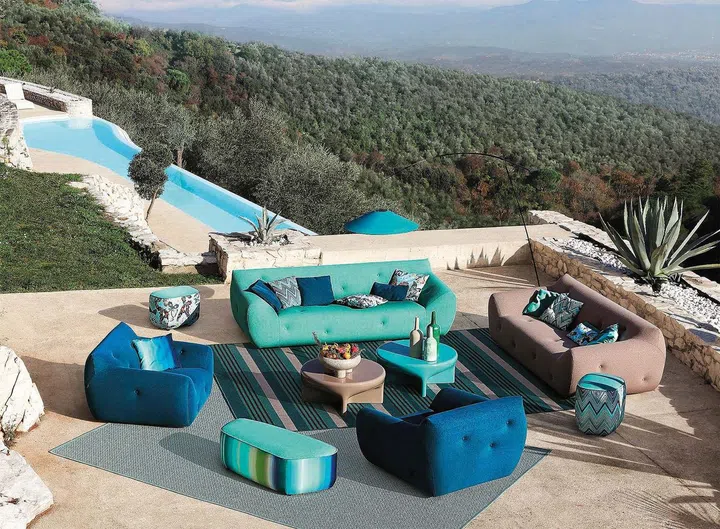 Roche Bobois今年也推出了Informel户外系列,清凉的色彩在庭院泳池边,筑起一道亮丽风景,为炎炎夏日送来凉爽气息。此外,其特殊的新型面料经得起户外风吹雨打,作为室内沙发也能称职。