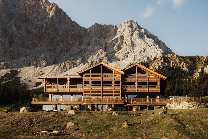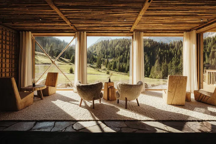 坐落于海拔近1600米的高山中,仅能通过缆车抵达,独特的抵达方式减少交通污染,也为住客带来远离尘嚣的体验。酒店于去年8月开幕,仅设9间客房,核心理念是与阿尔卑斯传统建立深厚的联系。建筑完美体现这一点,90%木材均取自当地森林,营造温暖而宁静的氛围,与周围自然景观无缝融合。