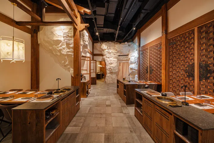 空间设计是品牌的一大记忆点。顾客缓缓沿着石墙进入“洞穴”,步入一个暖色调木质空间,整体氛围宁静而具格调。餐厅内洞穴风格的私人包厢、吧台位、靠窗位以及方桌区,都具有舒适的就餐节奏,兼顾聚餐需求。