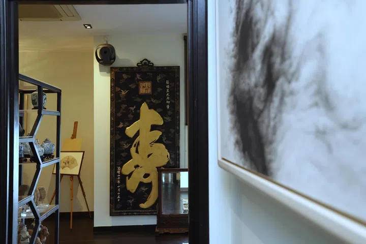 早期的收藏有一幅“寿”字艺术品,是他30多年前在本地一家画廊买的,他特别喜欢这个寿字。又如,有一对九龙图,是他早年第一次到中国北京长城旅行时,在一家古董店买的。