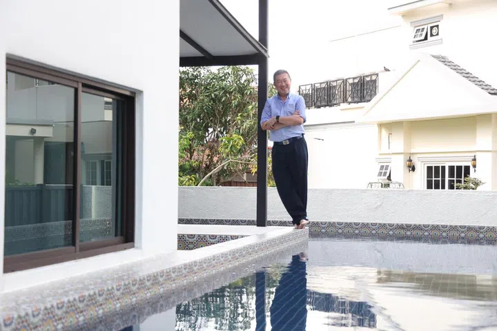 屋子的一个特色是有四五个露台。泳池旁边的露天位置,是蔡华新最喜欢的角落。他说:“这个露台有点像后花园,我喜欢在晚餐后坐在这里喝咖啡、喝茶或吃甜点,可以坐上好几个小时,享用退休后悠然自在的好时光。”