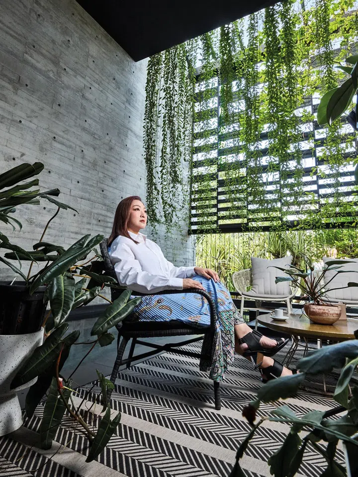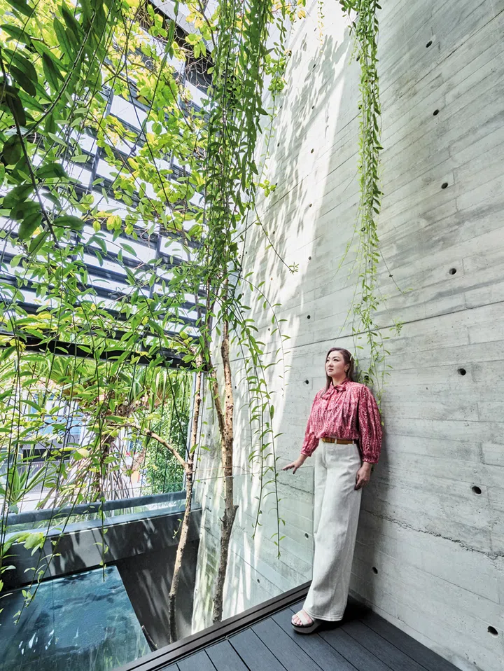 陈思璇的居所位于岛国东部,是一栋四层楼的排屋。外墙覆盖着茂密的垂直绿植,看起来与寻常有地房产无异,一楼是开放式厨房与起居室,亮点在二楼。