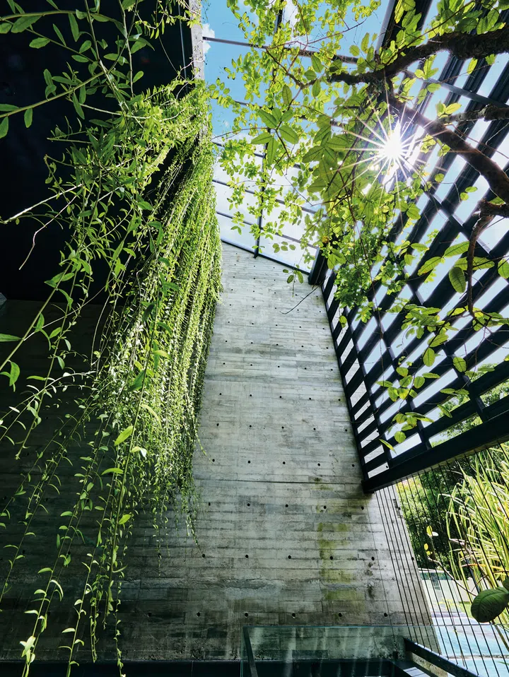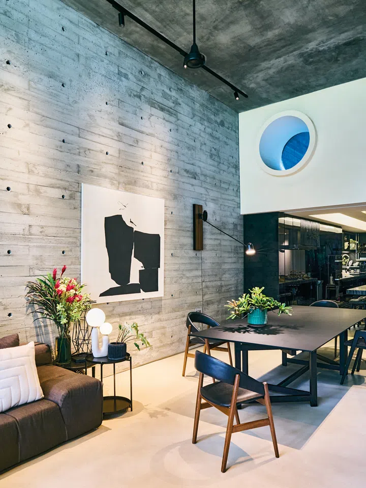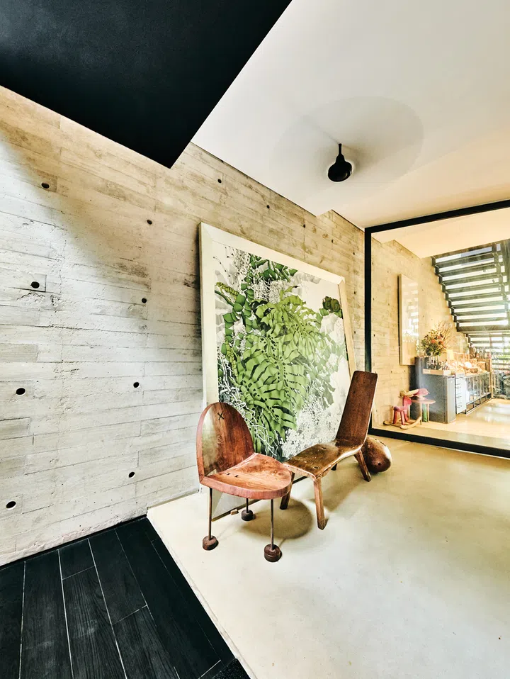 以她自家的设计为例,她选用清水混凝土和木纹模板打造墙面,并刻意保留施工过程中留下的螺栓孔。正是当初不设限的设计思路,使这些螺栓孔随着日常需求,发展出不同的功能。“我们发现这些孔位是挂画的最佳支点,不需要打钉就能轻松挂上巨型画作;它们也可以用来固定植物支架。这些随生活发现的小乐趣,让建筑与生活方式完美融合,更显自然与有机。”