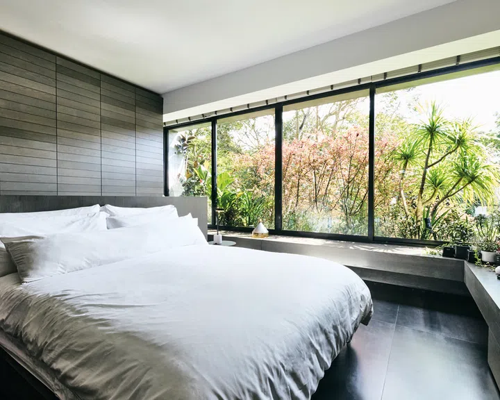 陈思璇另一破格设计是拆掉房子前后所有的玻璃窗,不仅增强空气对流,也让视野完全打开,室内与屋后公园的自然无缝衔接,打破疆界关系。为了更接近大自然,室内也不装窗帘,而是在窗边种满绿植,让它们自然生长,逐渐形成一层绿色屏障,既美观,又能保护隐私。