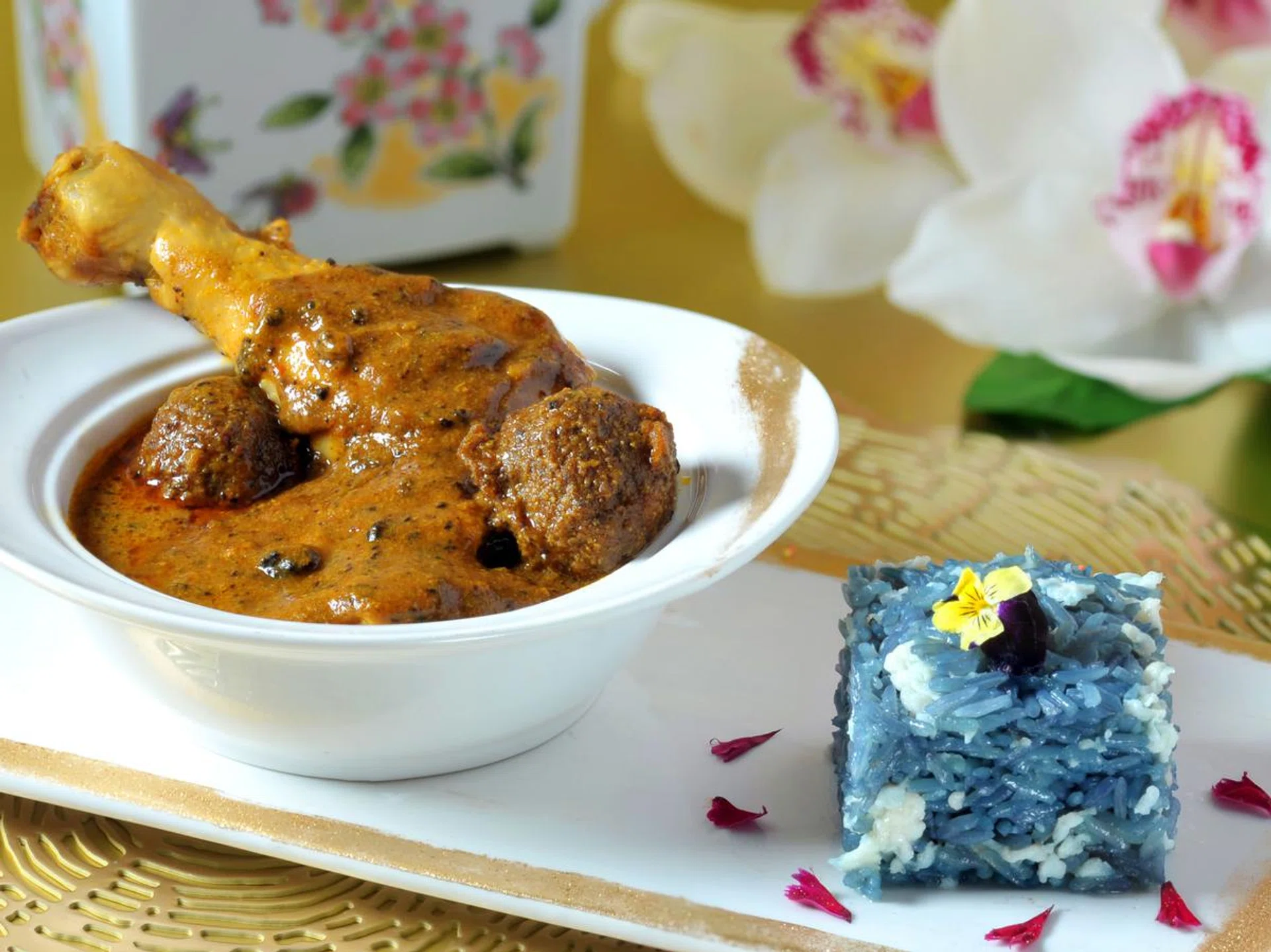 套餐就包括:咸菜鸭汤与燕窝饺 、 娘惹鳕鱼与炸虾 、黑果鸡与蝶豆花炒饭、椰糖熔岩蛋糕与椰子雪糕。