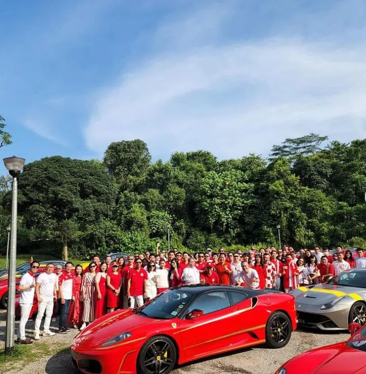 银行家Chermaine Pang与新加坡法拉利车主俱乐部(Ferrari Owners Club Singapore)一起庆祝国庆节,大家身穿红色与白色衣装,与跑车合影,画面壮观。