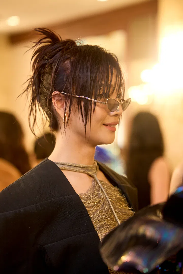 Fanty Soenardy 身着Louis Vuitton 2025早春度假系列秀场造型,灰蓝色马甲式展现未来机械感,发型方面以可爱蝴蝶结发型展示反萌差时尚感。