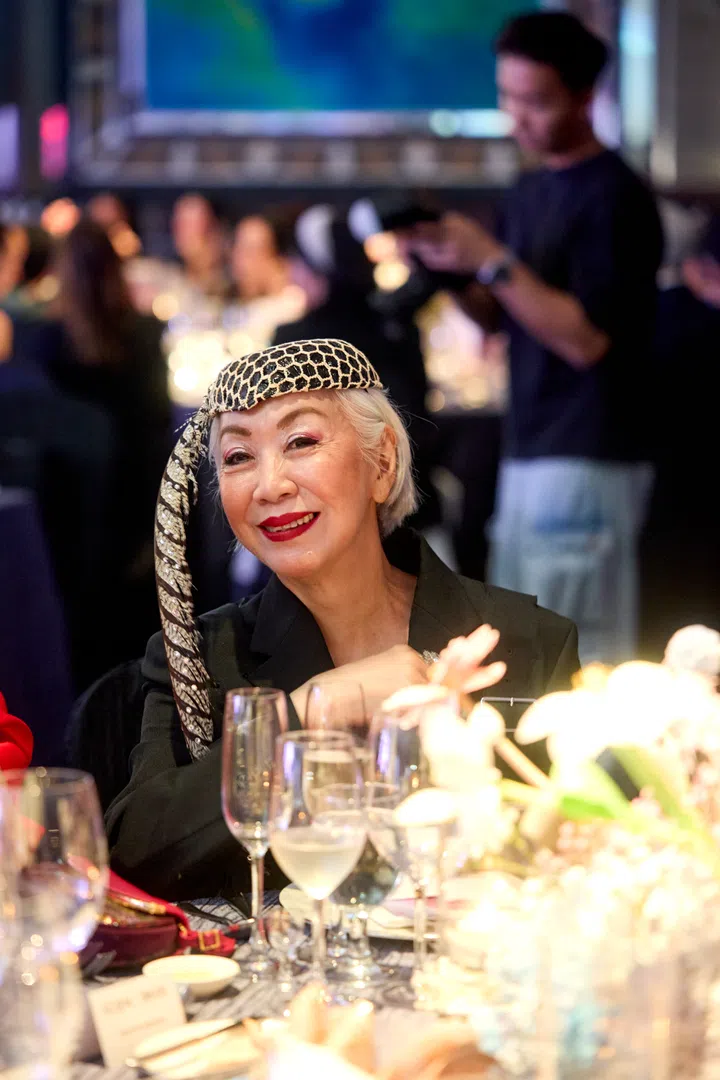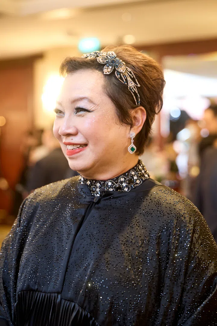 本地慈善基金会Kris Foundation创办人Kris Tan以别致的花朵设计头饰为造型增添亮点,优雅演绎短发也能展现高贵气质。