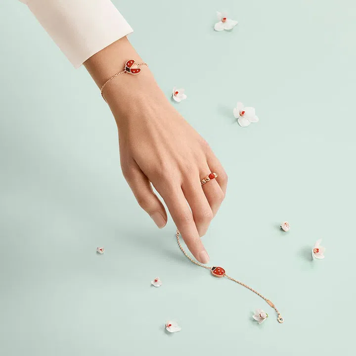 每年,梵克雅宝(Van Cleef & Arpels)都以生机盎然之作庆贺春临大地。这次,世家推出新作Lucky Spring系列,以缤纷绚烂的图案向这个万象更新的季节致意。梵克雅宝(Van Cleef & Arpels)将珍而重之的幸运祝愿,贯注入世家对大自然的幻想之中。瓢虫、梅花、铃兰的绿叶和花蕾互相映衬,细致的炫彩巧妙地呈现出品牌对生命的乐观信念。