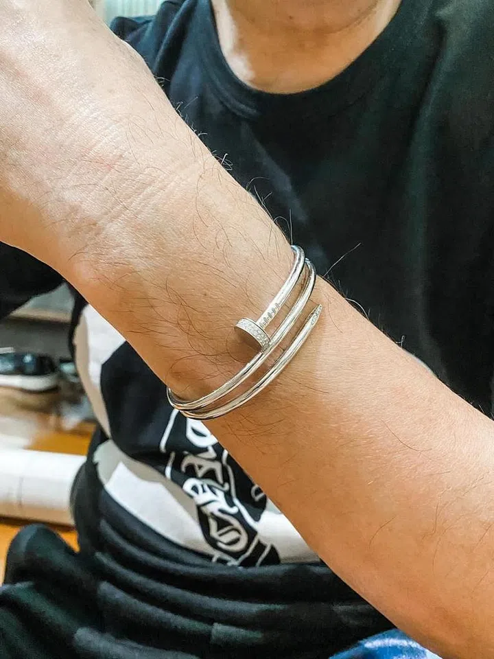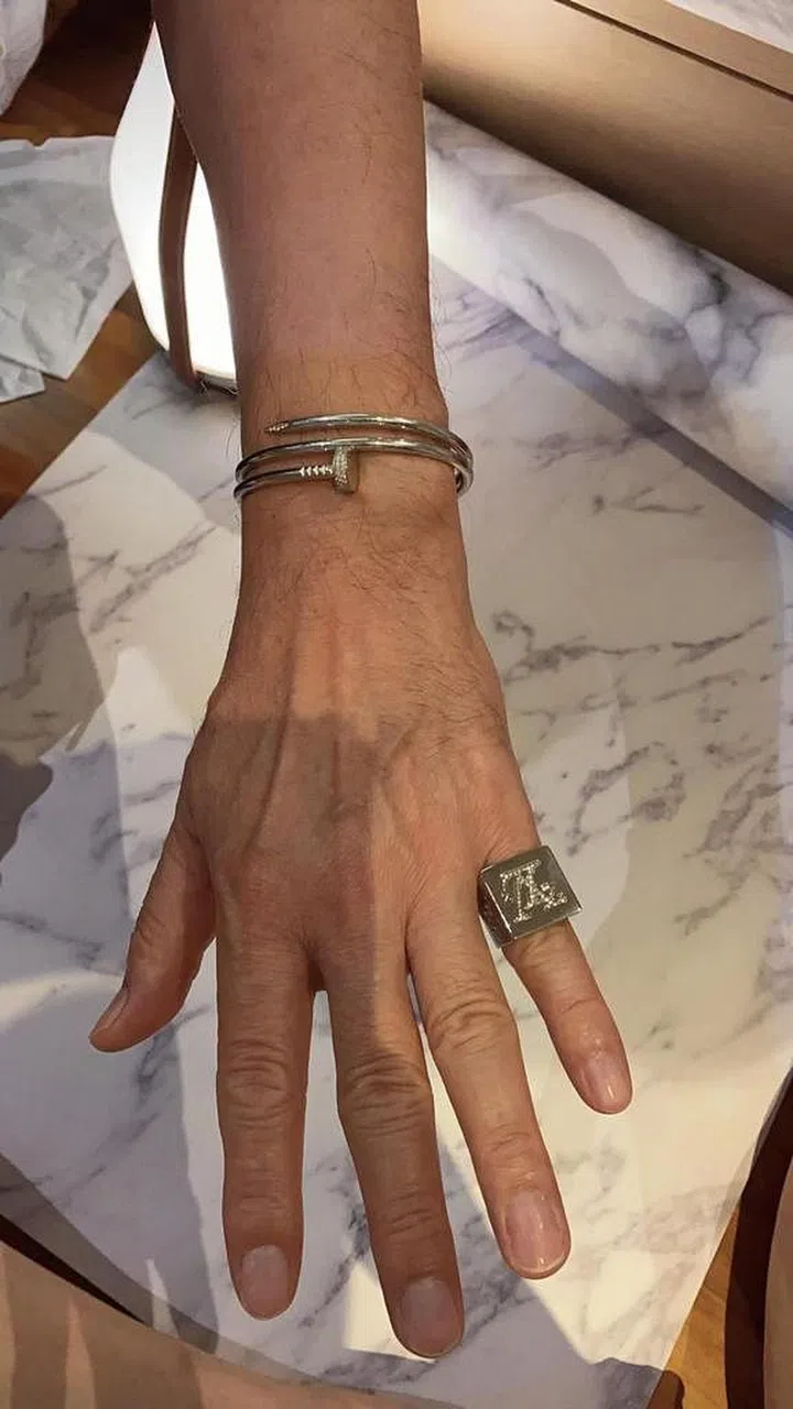 太太Emily送给Jeffrey当作某一年生日礼物的这款白金镶钻手镯,出自卡地亚(Cartier)的标志性系列之一——Juste un Clou。大胆摩登的设计,非常适合他的个性与风格。
