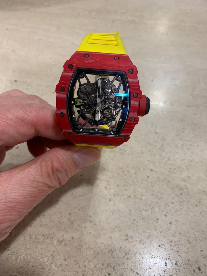 理查德米勒携手网球冠军纳达尔推出RM35-02,Quartz-TPT表壳采用高生物相容性、稳定性和抗震性的红树脂。红色Quartz-TPT每一层纤维都不超过45微米,并利用高科技自动器将每层改变45°,层层铺压,压制出品牌特有的红色。